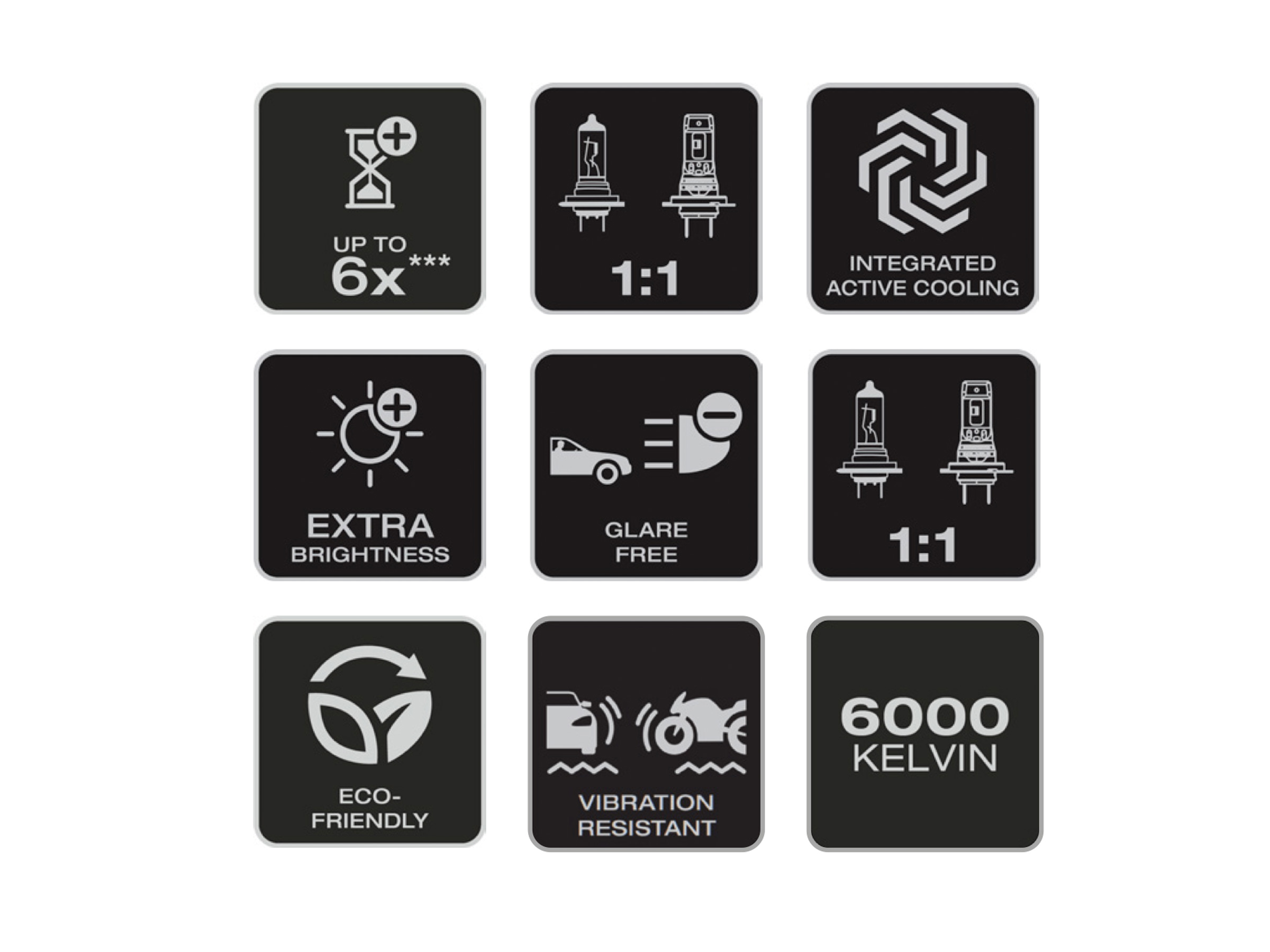 Diese LED- Austauschlampen sind als Ersatz für herkömmliche Lampen und Sockel geeignet. Sie bieten ein modernes und helles weißes Licht mit einer Farbtemperatur von bis zu 6000 Kelvinund beeindrucken mit bis zu 450% mehr Helligkeit 3) während die Blendung anderer Verkehrsteilnehmer die zulässigen Maximalwerte um bis zu 50% unterschreitet 2). Im Vergleich zu Standardlampen, wie z.B. Halogenlampen, verbrauchen diese LED-Retrofit-Lampen bis zu 60% weniger Energie und überzeugen dank der LED-Technologie und dem speziell entwickelten vibrationsfesten Design mit einer bis zu 6-fach längeren. Lebensdauer 3) .