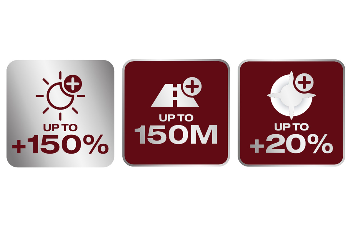 - Bis zu 150 % mehr Licht auf der Straße für ermüdungsfreies und komfortables Fahren