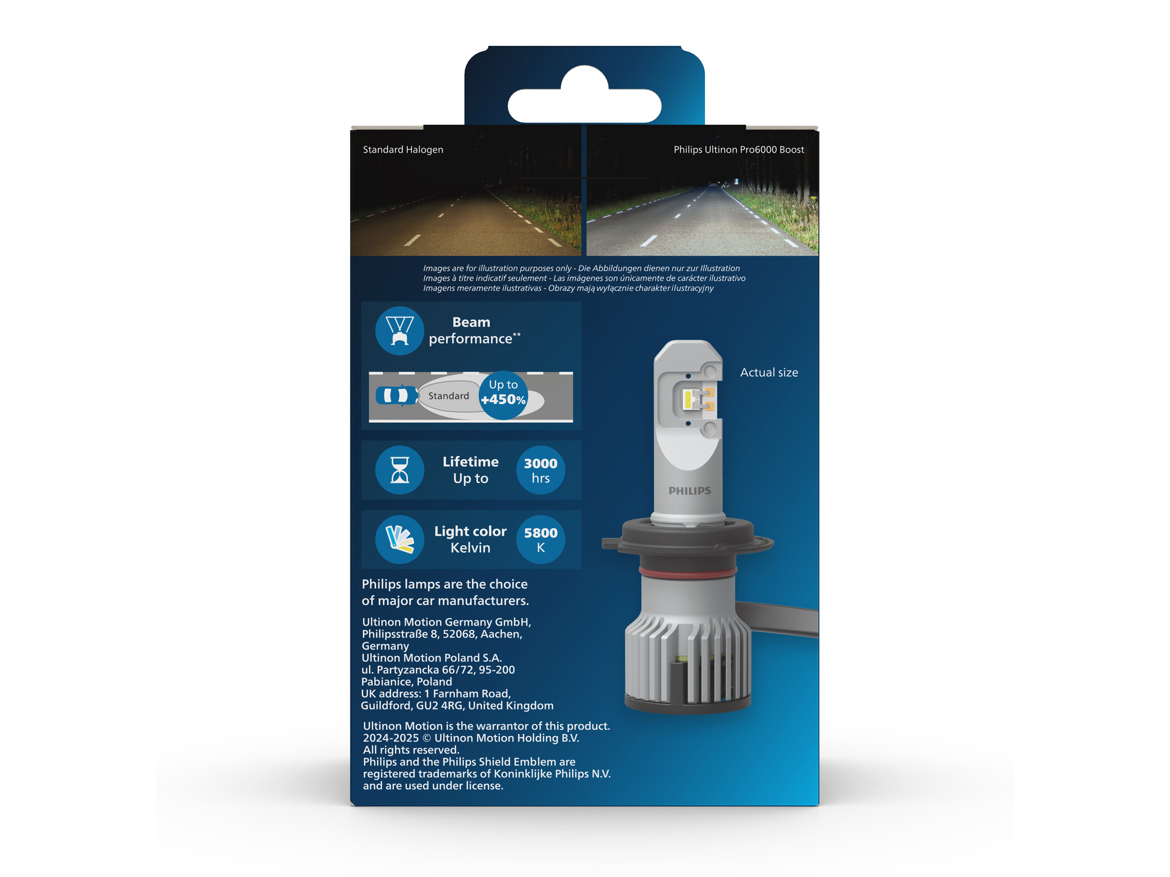 Philips Ultinon Pro6000 Boost bietet einen brillanten weißen Lichtstrahl, der durch eine einzigartige Farbtemperatur von 5.800 Kelvin erreicht wird. Das optimale Spektrum verbessert die Sichtbarkeit von Verkehrsschildern und macht sie für den Fahrer leichter erkennbar.